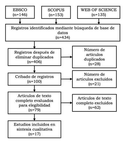 La revisión sistemática se basó en la declaración PRISMA-NMA (Hutton et al., 2016). A principios de 2021 se realizó una búsqueda de información en bases de datos especializadas, la primera se realizó en Ebsco, después Web of Science y por último, Scopus. Los primeros resultados arrojaron un total de 434 artículos publicados entre 2018 y 2020, en el cribado de registros se obtuvieron un total de 100 artículos que eran artículos de revista, con acceso al texto completo y que en el título, resumen o palabras clave estuvieran presentes los términos de búsqueda. Posteriormente, se realizó un análisis considerando los criterios de inclusión y exclusión, centrando el análisis sobre la implementación de una intervención mediada por tecnología en la prevención de VIH y en la que se señalara la evaluación de la aceptabilidad o viabilidad, quedando un total de 79 artículos. Todos estos artículos fueron gestionados en el programa EndNote X9, y posteriormente con base en la escala de calidad QUIRE Guidelines 2.0 (Ogrinc et al., 2015), los autores revisaron de manera individual los artículos para determinar la calidad de los artículos. Con base en lo anterior, se compararon los resultados de inclusión o exclusión, si había consenso se introducía o descartaba de la revisión sistemática; pero si la evaluación difería, entonces se discutía el artículo para delimitar su inclusión o exclusión, finalmente se eligieron 17 artículos -ver figura 1-.